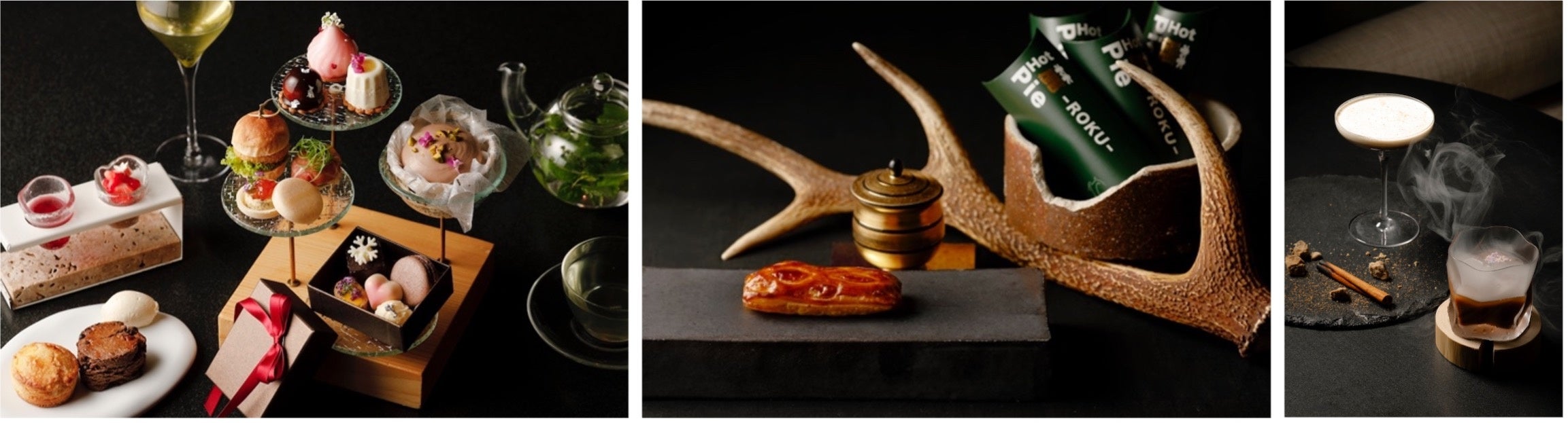 写真左:冬アフタヌーンティー -白銀- |「TENJIN」シェフズテーブル HOT 麓 PIE |「TENJIN」ザ バー ROKUアイリッシュコーヒー/ミッドナイトソナタ