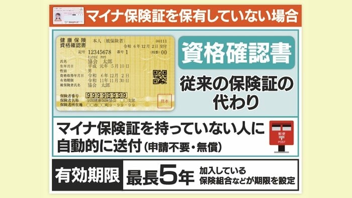 マイナンバーカードを所持していない場合、従来の保険証の代わりとなる「資格確認書」が自動的に送付されます。加入している保険組合などが期限を設定することになっており、有効期限は最長5年です。