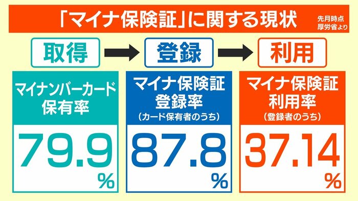 10月末時点でのマイナンバーカードの保有率は、79.9%。そのうち「マイナ保険証」を登録している人は、87.8%だといいます。しかし、「マイナ保険証」の利用率は、37.14%にとどまっているのが現状です。