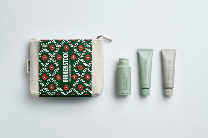 華やかフェスティブシーズンに向けて、BIRKENSTOCK CARE ESSENTIALSより初めてのホリデーセットが登場いたします。このセットでは、三つのフット&ボディケアのマストハブアイテムがホリデーらしいパッケージのポーチに入り、大切な人へはもちろん、自分への贈り物にもぴったりです。