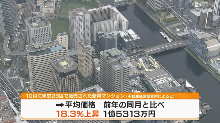 不動産経済研究所によりますと、10月に東京23区で販売された新築マンションの平均価格は、2024年の同じ月と比べて18.3%上昇し、過去2番目の高さの1億5313万円となりました。