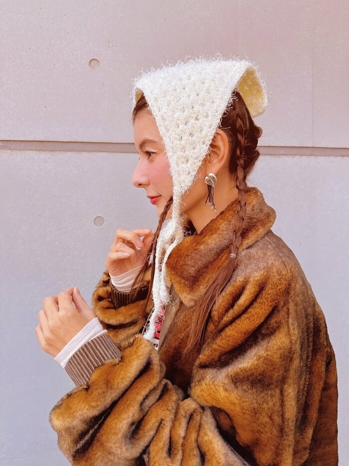 バブーシュカを身につけた横顔のショットを見ると、どうやらフワフワとした素材の毛糸を使っている様子。キレイに編まれていて、丁寧に作業したことがうかがえます。