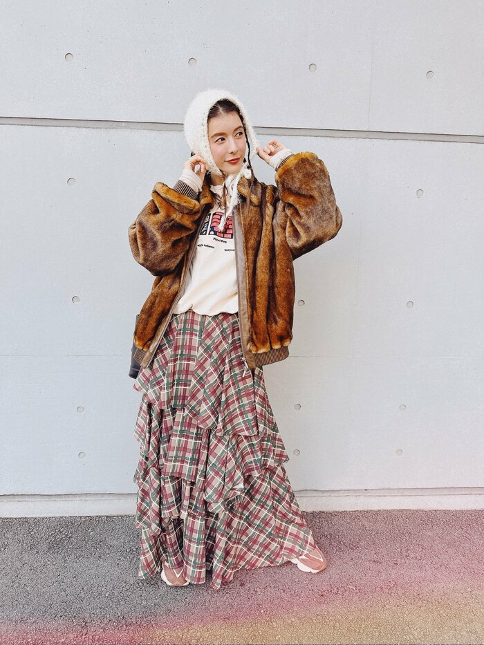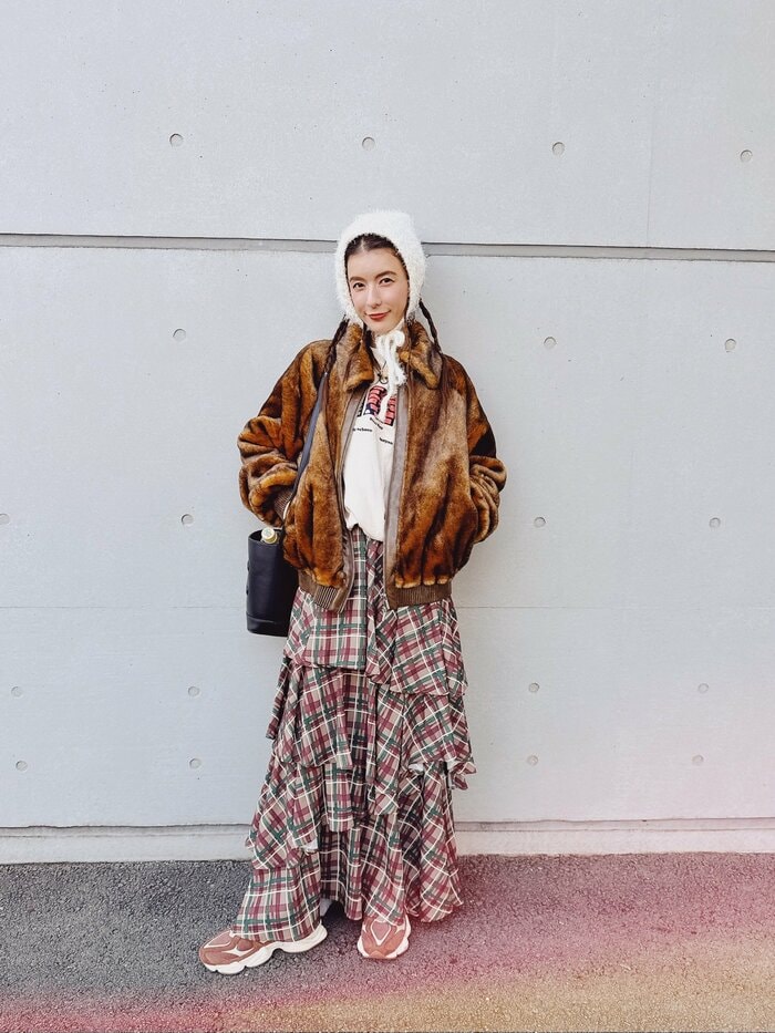 そこには、真っ白なバブーシュカをかぶり、ポケットに手を入れてポーズをきめるスザンヌさんの姿が。この日のコーデは、ブラウンのジャケットを羽織り、チェック柄のフリルスカートを合わせています。