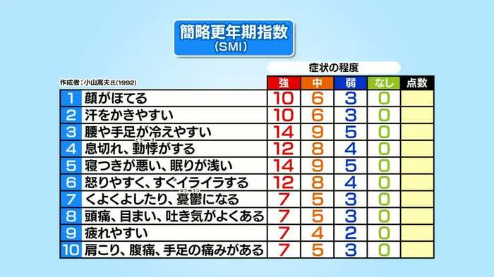 番組では、更年期なのかどうか判断するための「セルフチェックシート」を紹介。10項目の数字の合計が50以上の人は、婦人科に相談してみたほうがいいのだそうです。