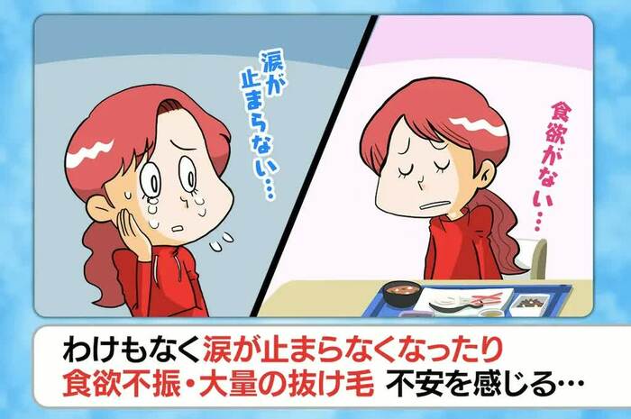 「4ヵ月前に出産。涙が止まらなくなったり、食欲が出なかったり、抜け毛が増えたりと、自分で自分の体がコントロールできないのが怖い」という女性のエピソードも登場しました。