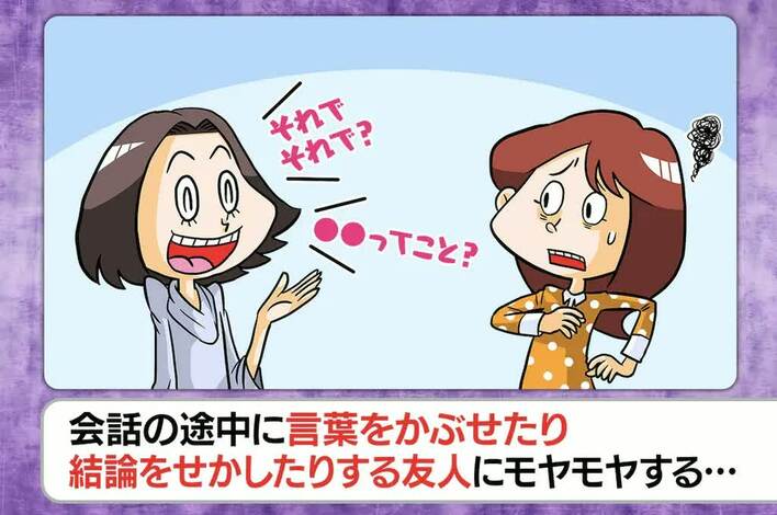 まず紹介されたのは、「こちらが話しているのに、会話の途中に言葉をかぶせてきたり、結論をせかす友人がいる。表面的にしか話を聞いてくれていないようで、モヤモヤする」というエピソードです。