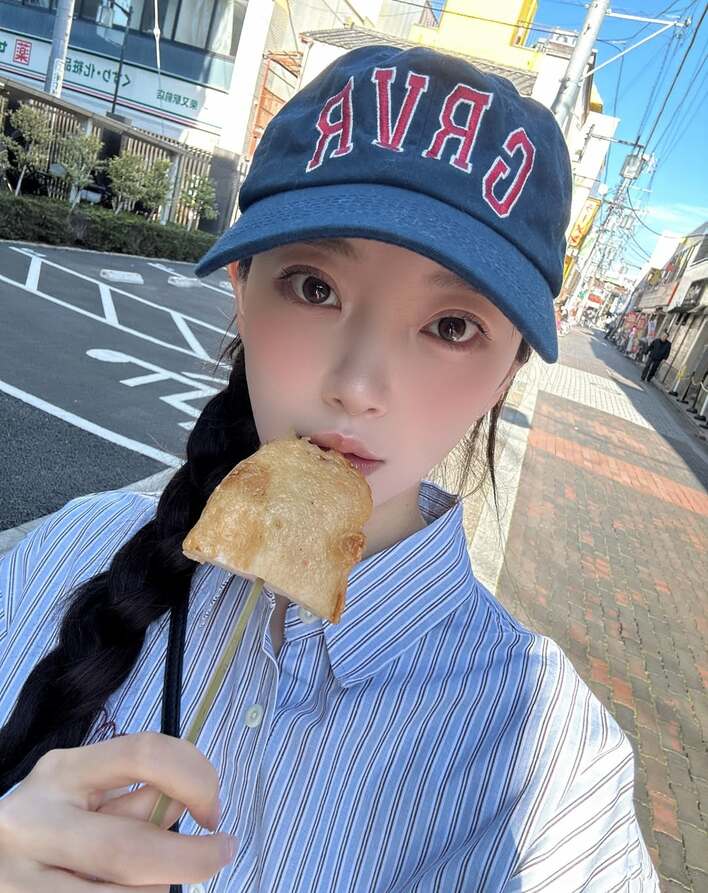 気持ちがいいくらいの晴天の中、商店街の道を歩く堀さんは、青いキャップ帽と爽やかな水色のストライプシャツ姿を披露。串に刺さったさつま揚げを手に、食べ歩き中の自撮りショットを公開しました。