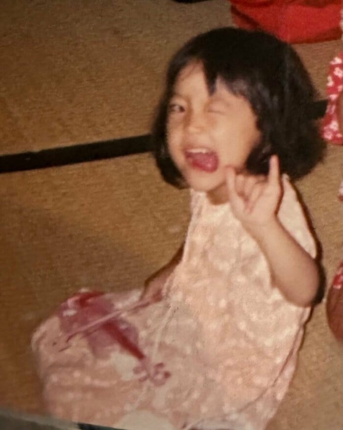 食べ歩きの自撮りショットと共に、自身の幼少期の姿も公開しました。
