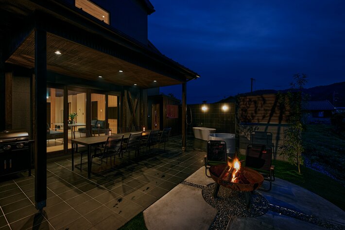 ジャグジーは夜になるとやさしい光で照らされ、水面にほのかな反射が広がります。白いジャグジーと黒のタイルが落ち着いたコントラストを生み、スタイリッシュでリラックスできる空間に。併設の焚き火を眺めながら過ごせば、穏やかに心身をほぐす夜のひとときをお楽しみいただけます。