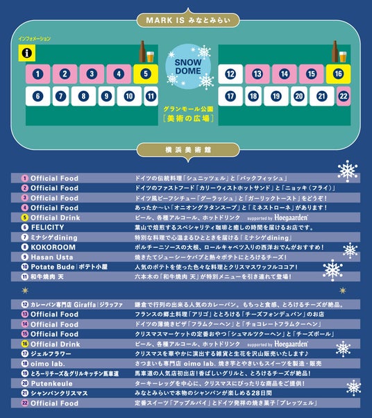 22基のヒュッテ(木製の露店)が、ヨコハマミライトのイルミネーションとともにグランモール公園を明るく照らします。