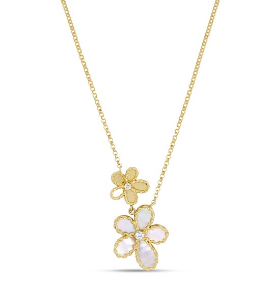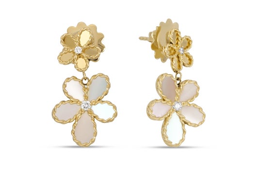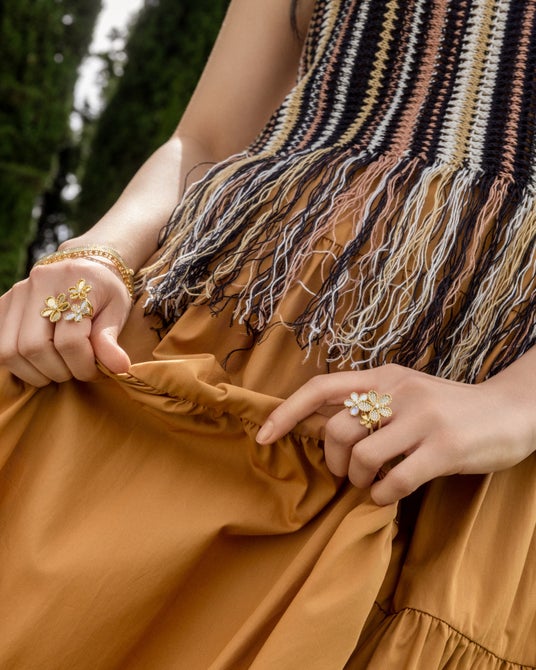 緻密な技術と詩的な美しさが共鳴するデザイン「ジャスミン」コレクションは、花びらを思わせる有機的なフォルムが特徴。マザーオブパールの柔らかで乳白色の艶めきが、花のもつ優しさを表現し、朝露のようなダイヤモンドのきらめきが瑞々しさと透明感を加えます。花びらのサテン仕上げはすべて職人の手作業によって施され、一本一本の彫りの深さや角度までも緻密に設計されています。軽やかなイエローゴールドがコレクション全体を包み込み、ラグジュアリーでありながら、日常にも自然に寄り添う存在感を放ちます。