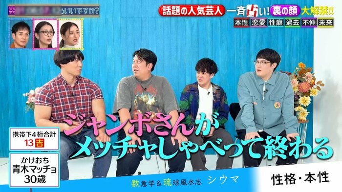 11月30日放送の『突然ですが占ってもいいですか?』は、“話題の人気芸人一斉占い”として、かけおちの青木マッチョさん、レインボーのジャンボたかおさん、ファイヤーサンダーのこてつさんと﨑山祐さんが、シウマさんに占われました。