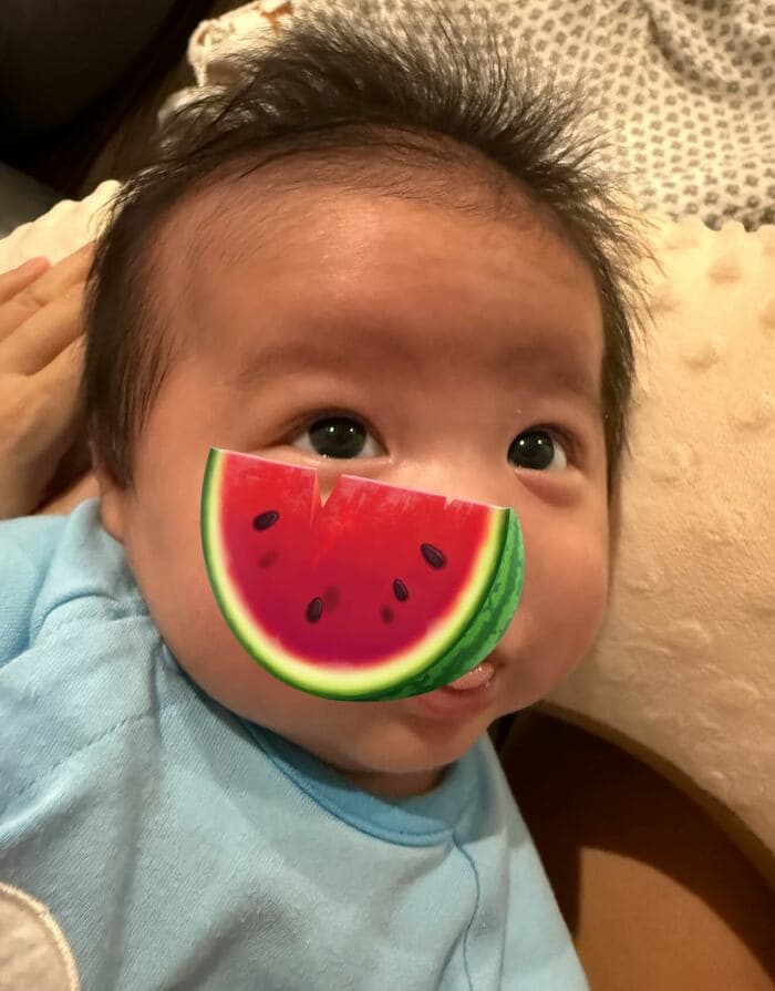 スイカコーデに身を包むお兄ちゃんについては、「あまえん坊 だっこ大好き」なんだとか。「ず~~~と おっぱいすってきますね まだまだムチりそうだ」と、つづっています。