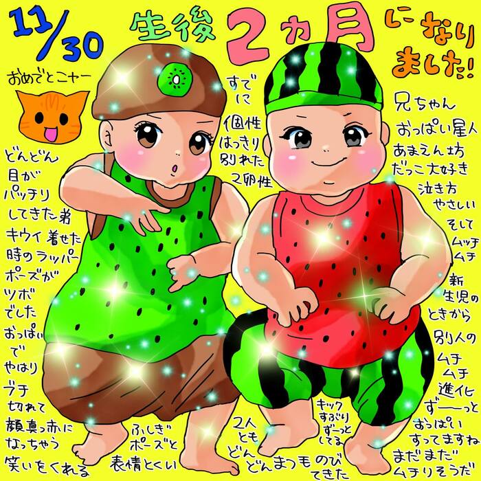 双子が生後2ヵ月を迎えたことを報告し、絵日記や最新ショットを公開しました。