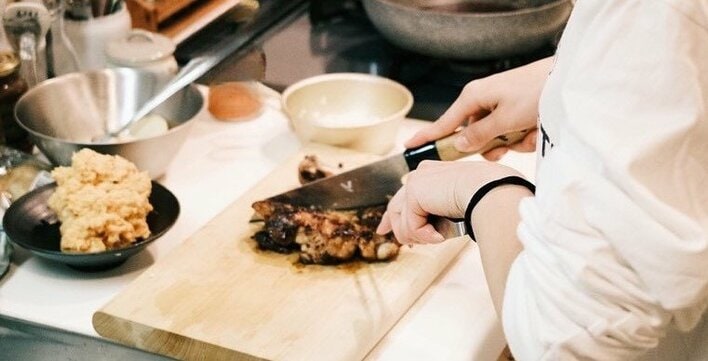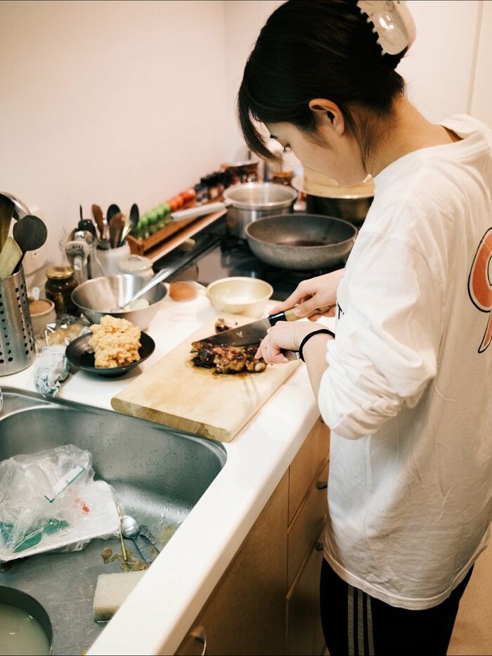 キッチンで、麹に漬けていた鶏肉をまな板の上に置きカットする一コマがおさめられています。