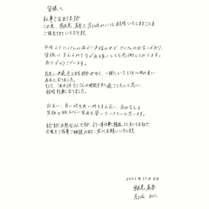 その後、自身のInstagramを更新し、「私事ではありますがこの度、宇佐見真吾と高城れには結婚いたしますことをご報告させていただきます」と連名で直筆によるメッセージを投稿。