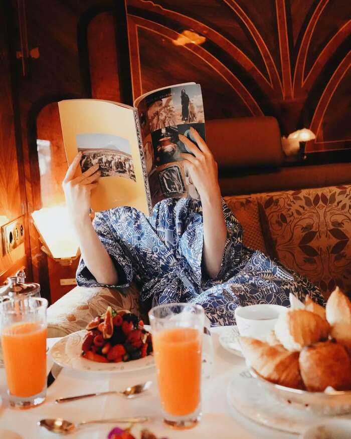 さらに、客室での朝食風景も公開!気品ある雰囲気の客室で本を手に持ち、顔は隠していますが、浴衣のような寝巻き姿を披露した藤井さん。テーブルの上には野菜ジュースのような飲み物や、バケットが盛られたお皿…、さらにイチゴやラズベリー、イチジクなどフレッシュなカットフルーツが並んでいます。何気なく置いてあるスプーンなど、一つ一つが高級品に見えます。