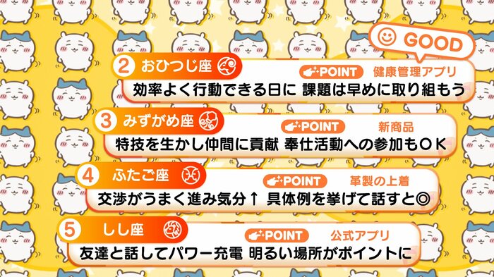 『めざましテレビ』で放送中の「ちいかわ占い」 テレビ放送がない日はお休みで、月~土:朝7時以降に更新予定です。