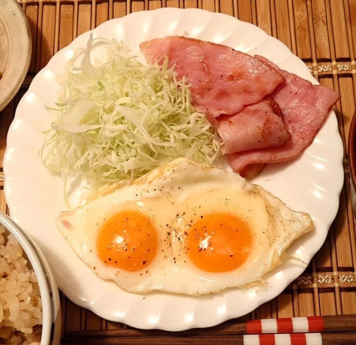 そして真ん中には、たっぷりと盛られたキャベツの千切りに、こんがりと焼き色がついた大きなベーコン、とろっとした黄みが2つ落とされた目玉焼きが並んでいます。
