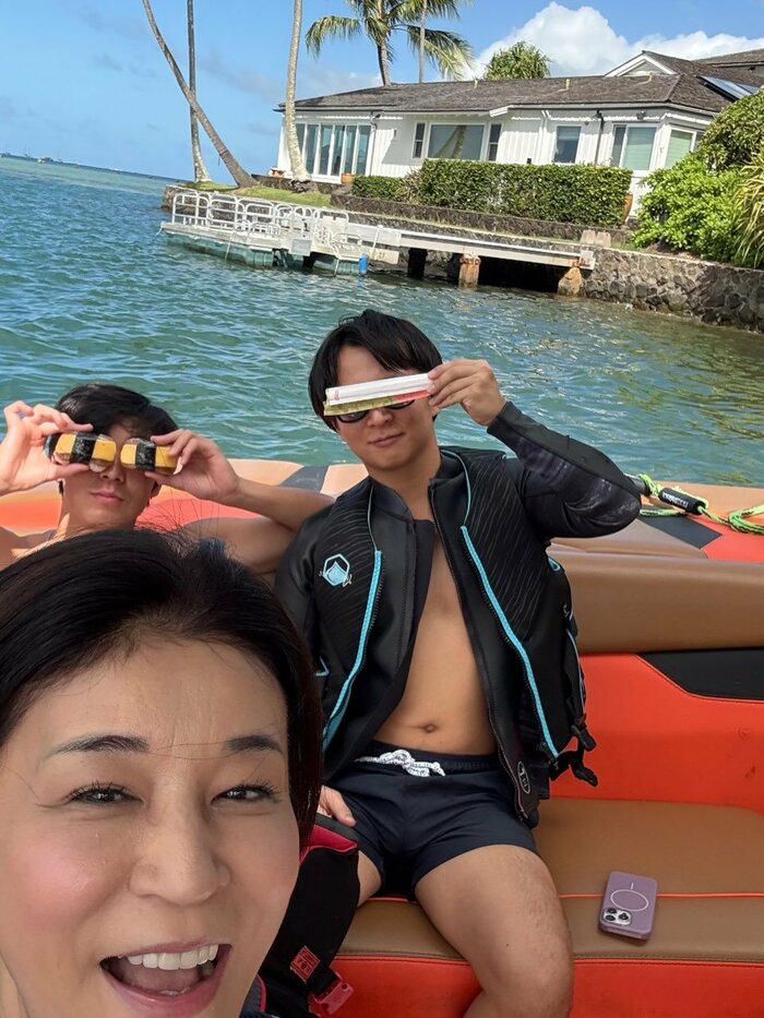 さらに、満面の笑みを浮かべた高嶋さんとともに、息子たちが各々好きなポーズをしてパシャリ!ランチョンミートがのったおにぎりやお箸で目元を隠す、ユーモアあふれた1枚になっています。