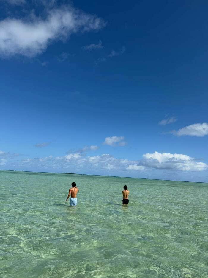 また、青空の下、透き通った海に入る息子たちのショットも披露しています。