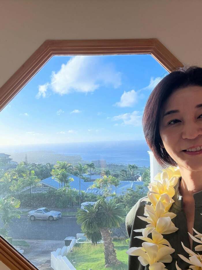 そこには、窓から広大な海が見える場所で、花の首飾りをかけて記念撮影する高嶋さんの姿が!