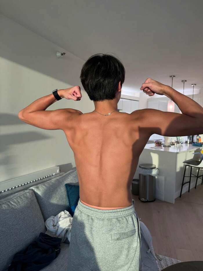 他にも、上半身裸になった姿で後ろを向き、両手の握りこぶしを顔の横に挙げた“マッスルポーズ”を披露!背中や腕の筋肉がムキムキになり始めていて、なんともたくましいショットですね。