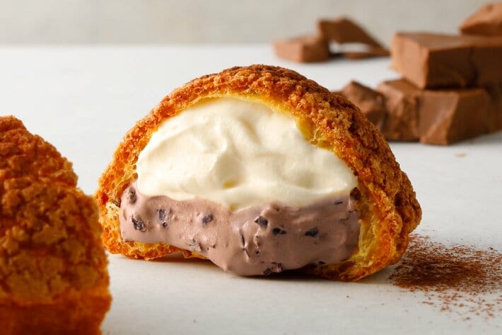厳選したミルクと良質なチーズで作り上げる人気のチーズパフから、冬季限定のショコラ味が登場!カマンベールチーズクッキーをのせて焼き上げたシュー生地に、北海道産生クリームとマスカルポーネでまろやかに仕上げたマスカルポーネクリーム、さらにアクセントにチョコチップ、隠し味にヘーゼルナッツペーストを加えたマイルドなショコラクリームの2種類のクリームを詰めました。