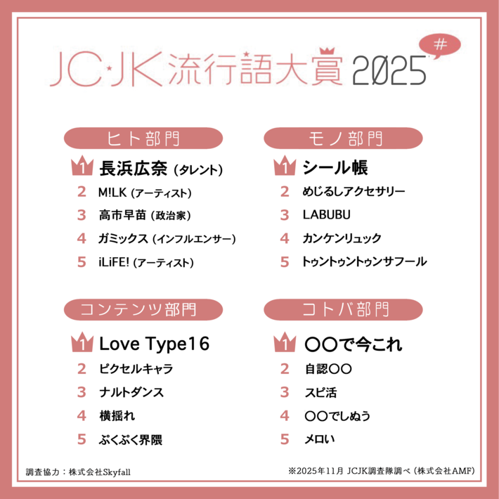 2017年にスタートした「JC・JK流行語大賞」は、Z世代マーケティングの先駆者である株式会社AMFが主催・運営する、女子中高生の“リアルな感性”をもとに選出される唯一のトレンドアワードです。 選考には、Z世代の市場調査に強みを持つSkyfall社との共同で実施された、全国の女子中高生約1,000人を対象としたアンケート結果と、日々トレンドを追うマーケティング集団“JC・JK調査隊”の精鋭メンバーによる選考を反映。SNSで実際に使われている言葉やアイテム、話題のコンテンツ、注目の人物まで、4部門にわたり“共感度の高い流行”を可視化しています。 発表後には、SNSインプレッション初日1.9億回超/年間広告換算額25億円超と、企業・メディア双方から高い注目を集める、日本を代表するZ世代トレンド指標のひとつです。
