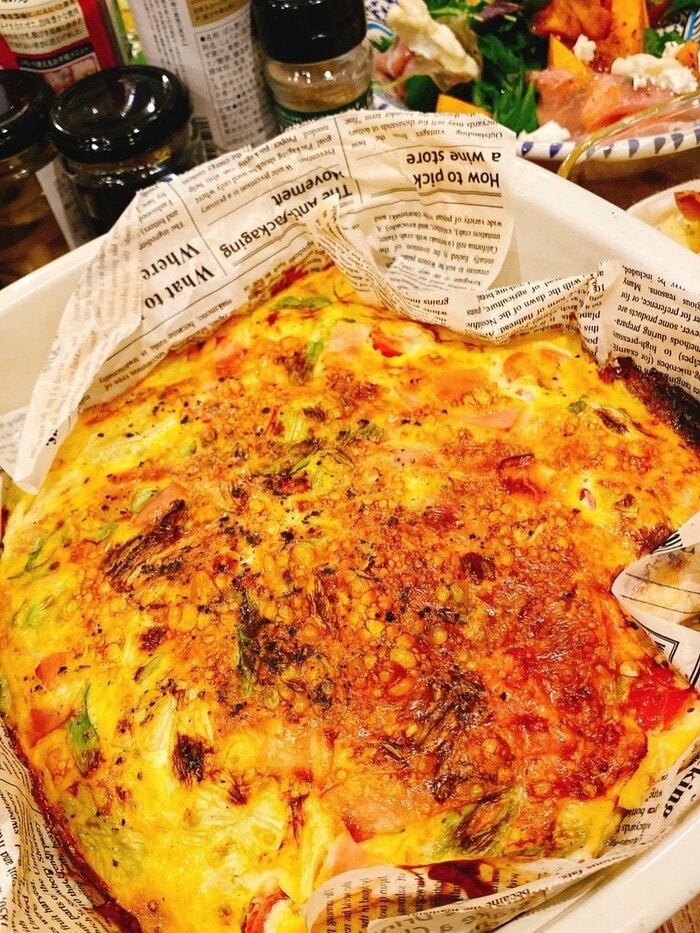 続けて「あと久しぶりに具沢山ふわふわオムレツも 子どもたちもいっぱい食べてくれて鍋いっぱい作った甲斐があった!しあわせだ、ありがとう」とつづると、こんがりとした焼き目が食欲をそそる、写真映えしそうな大皿料理を公開。