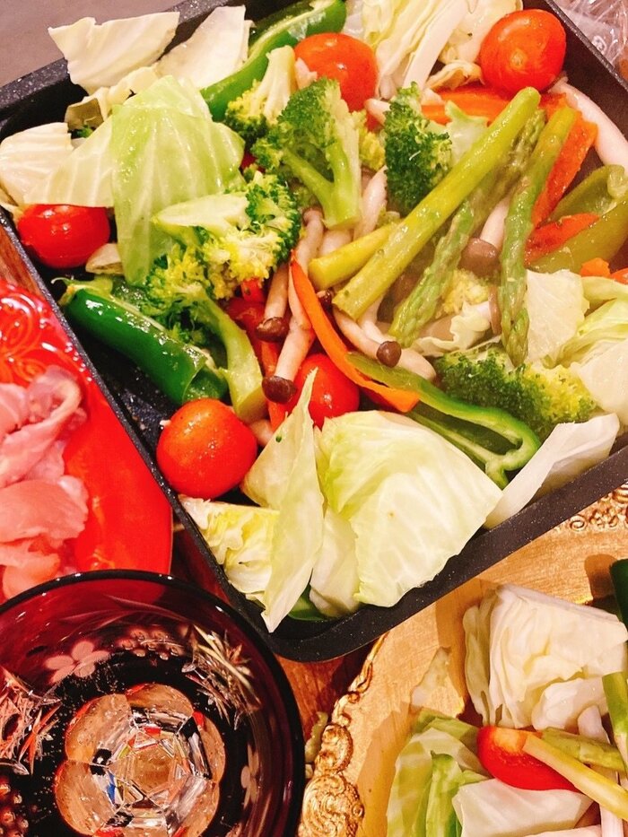 ブロッコリー、アスパラガス、ミニトマト、キャベツ、ピーマン、しめじなど、野菜たっぷりの料理を披露。