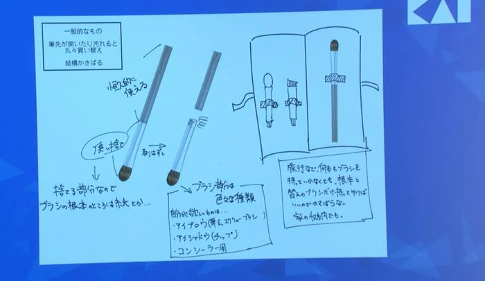 イベントでは、昨年板垣さんが発案した、筆(ブラシ)部分のみ取り外しができる、カートリッジ式メイクブラシが来年の春に商品化されることを発表。