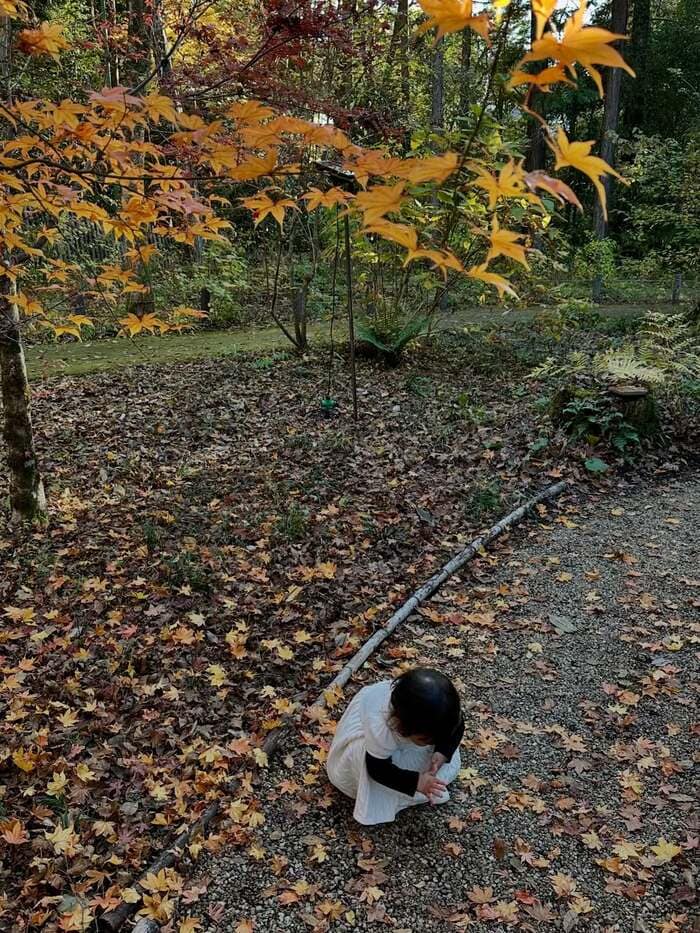そして、娘が落ち葉のじゅうたんが広がる地面にしゃがみ、興味津々な様子で何かを観察している姿も。