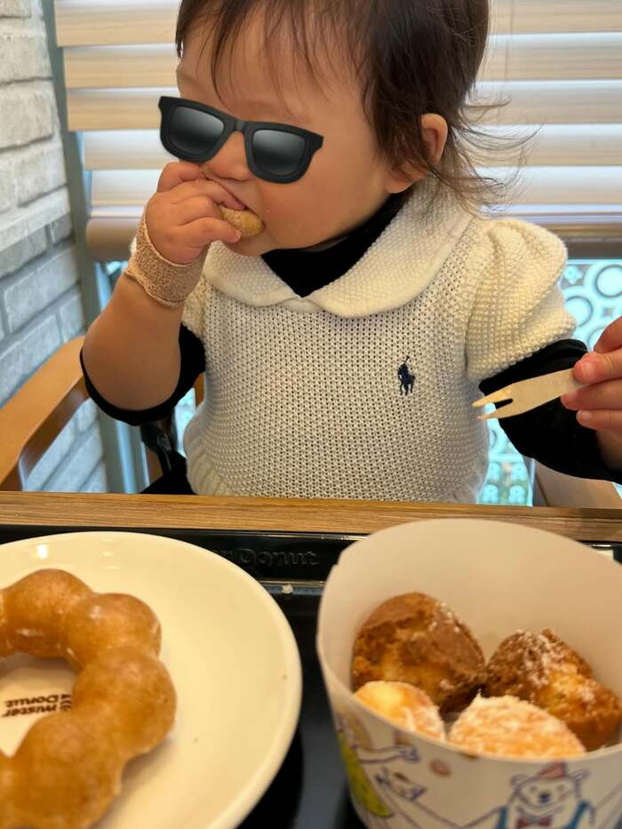 小さな手でドーナツをつかみ、口を大きく開けて幸せそうに頬張っている姿はなんとも愛らしく、ほほ笑ましい気持ちになりますね。