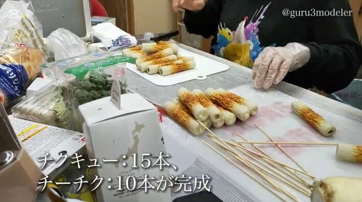 まずは、ちくわの穴にきゅうりを差し込んだ「チクキュー」を15本。また、チーズを入れた「チーチク」を10本と、手際よく進めていきます。