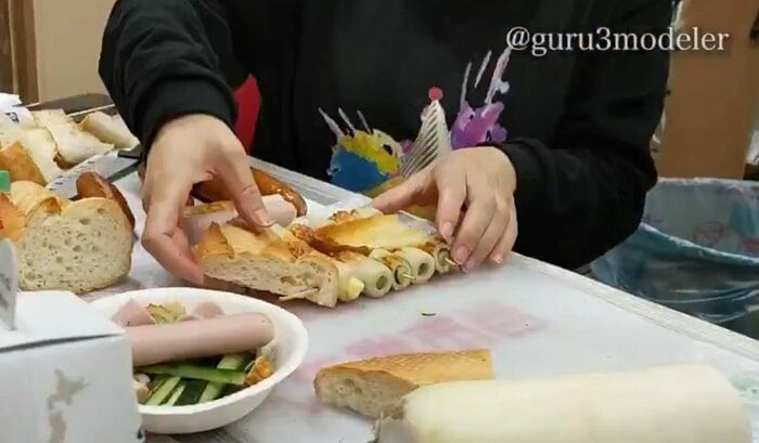 扉はカットしたフランスパンを使うようで、微調整を繰り返しながら ちくわとうまく組み合わせていきます。長いちくわを短くカットし、バランスを見ながらくっつけるようです。
