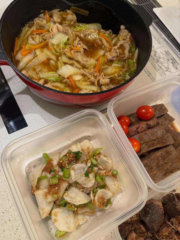 そして、鍋では豚肉、白菜、キャベツ、にんじん、タマネギなどが色鮮やかに煮込まれていて、そばには、カブとネギの和え物や薄切りのステーキが詰められた保存容器が並べられています。