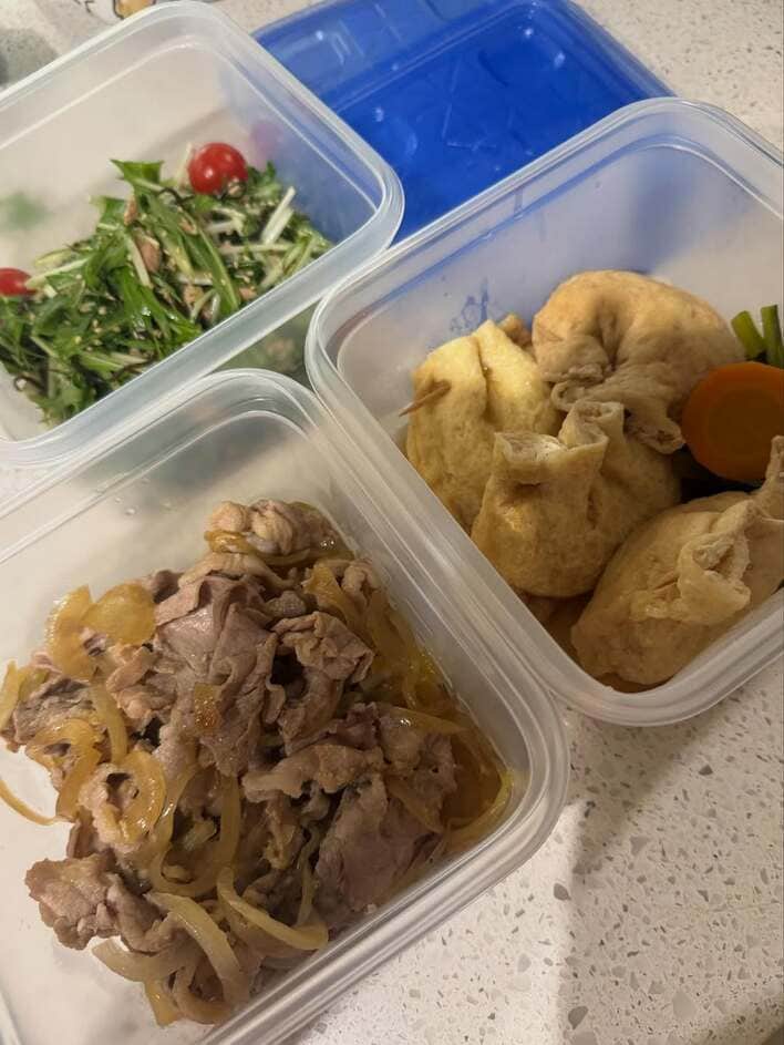 まずは、3種類のおかずを写したショット。牛肉とタマネギの炒め物や、にんじんや油揚げの煮物、そして緑の葉物野菜とミニトマトのサラダといった栄養バランス満点なメニューが、透明の保存容器に詰められています。色とりどりの野菜とお肉の組み合わせが食欲をそそりますね。