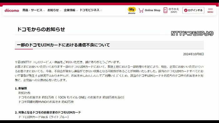 NTTドコモは、2024年10月8日、SIMカードについて製造不良により通信できなくなる恐れがあると発表。その数は約93万枚。