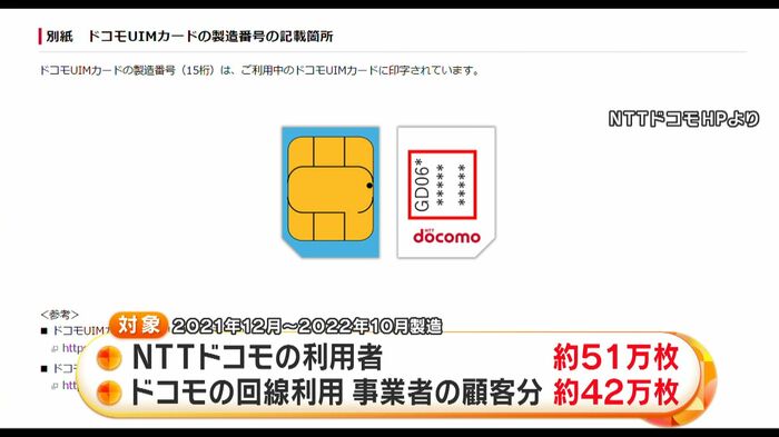対象となるのは、2021年12月から2022年10月に製造されたカードで、NTTドコモの利用者が約51万枚と、ドコモの回線を利用して通信サービスを提供する事業者の顧客分が約42万枚、合わせて約93万枚。