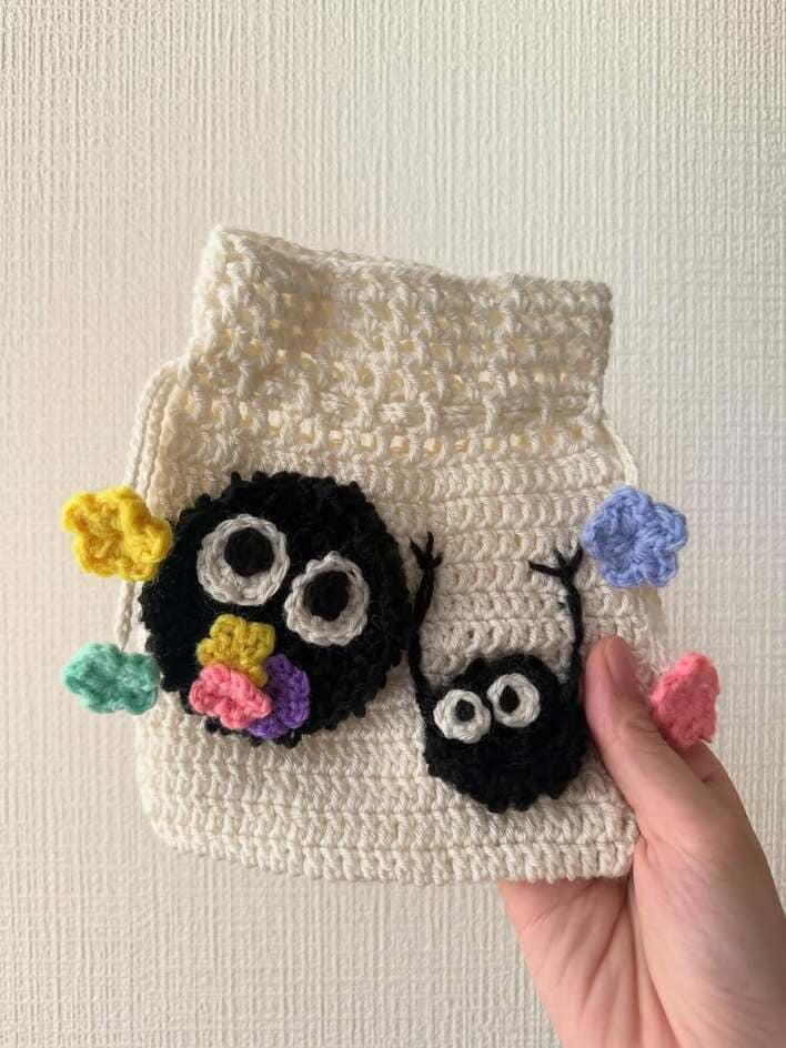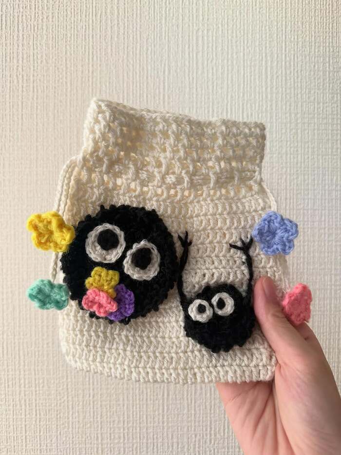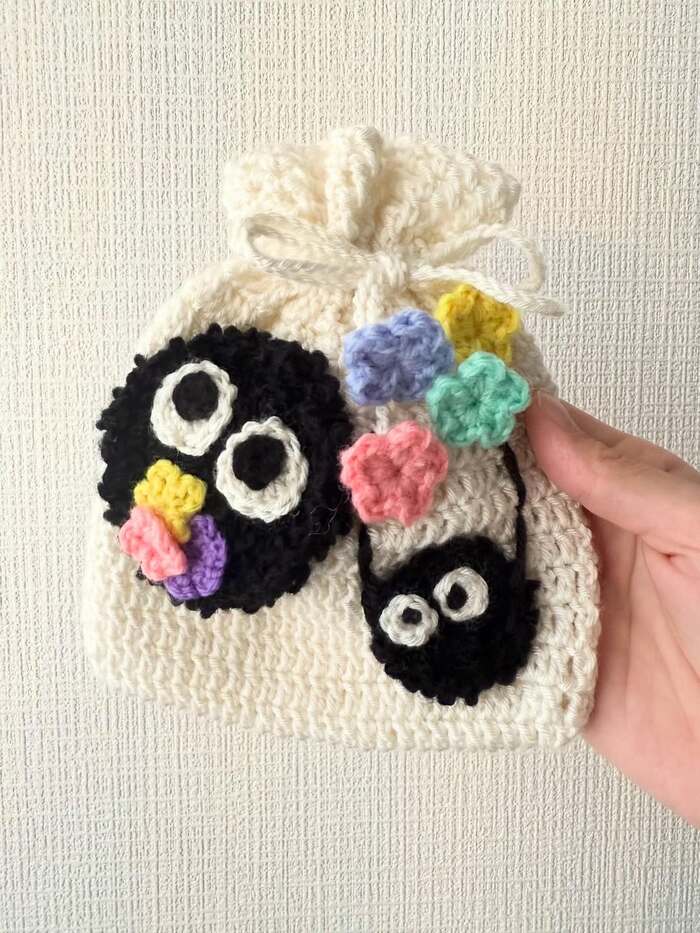 白色の糸で編まれた巾着には、ジブリ映画『千と千尋の神隠し』などに登場していた、こんぺいとうが大好物の、黒色の「ススワタリ」が大小2匹編まれています。