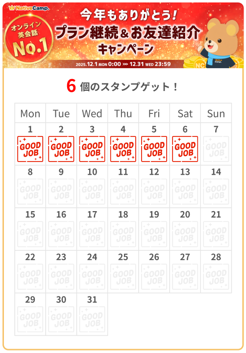 2025年も残すところあとわずかとなり、日頃よりネイティブキャンプをご愛顧いただいている皆さまへ感謝の気持ちを込めて、豪華3大イベントをご用意しました。「プレミアムプラン継続特典」や、大切なご友人と一緒に英語学習を始められる「お友達紹介スペシャル」、年末の学習を応援する「レッスンスタンプラリー」など、お得なイベントが満載です。この機会にぜひ、ネイティブキャンプで英会話学習をお楽しみください。【キャンペーン期間】