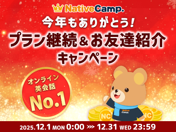 ネイティブスピーカーと回数無制限のオンライン英会話サービス「ネイティブキャンプ英会話」を展開する株式会社ネイティブキャンプ(東京都渋谷区 代表取締役:谷川国洋)は、2025年12月1日(月)より「今年もありがとう!プラン継続&お友達紹介キャンペーン」を開催いたします。