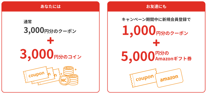 お友達にネイティブキャンプをご紹介いただくと、紹介者様には通常3,000円分のクーポンに加え、3,000円分のコイン(1,500コイン)をプレゼント。さらに、お友達も5,000円分のAmazonギフト券と1,000円分のクーポンがもらえます!
