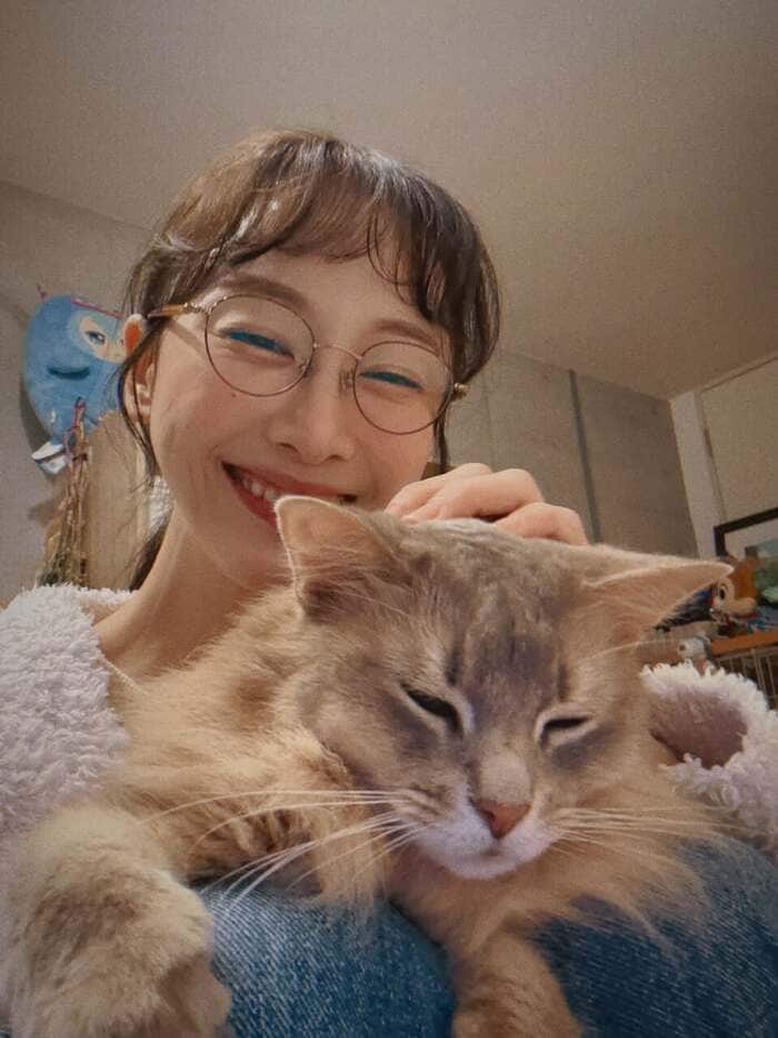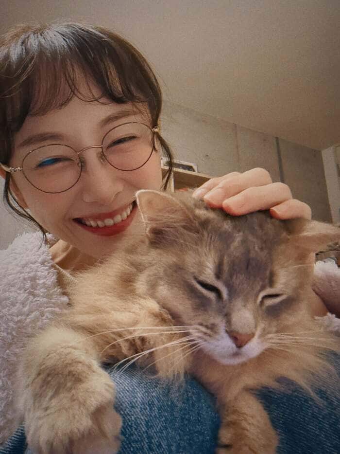 さらに今度は、膝の上に猫を乗せながら、頭をよしよしと優しくなでているカットも公開。
