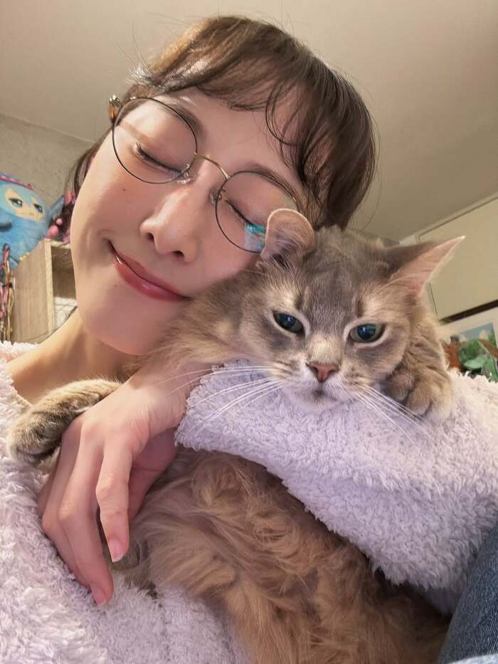 片腕で猫を抱き寄せて、両目をつぶりながらほっぺたでスリスリかわいがっている様子も。