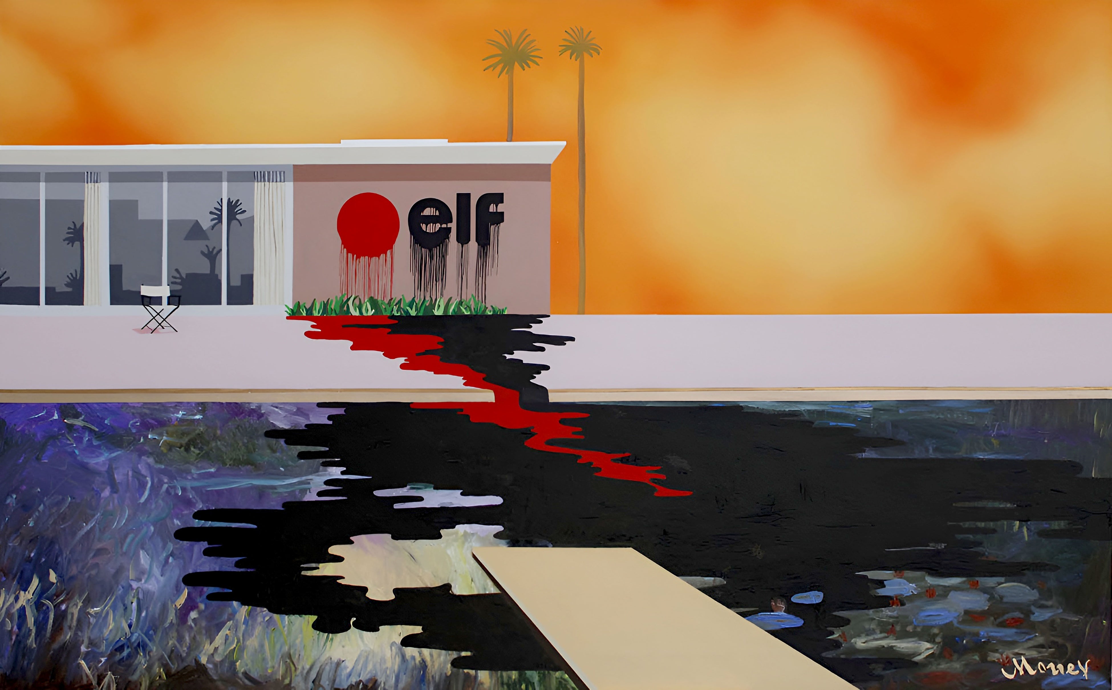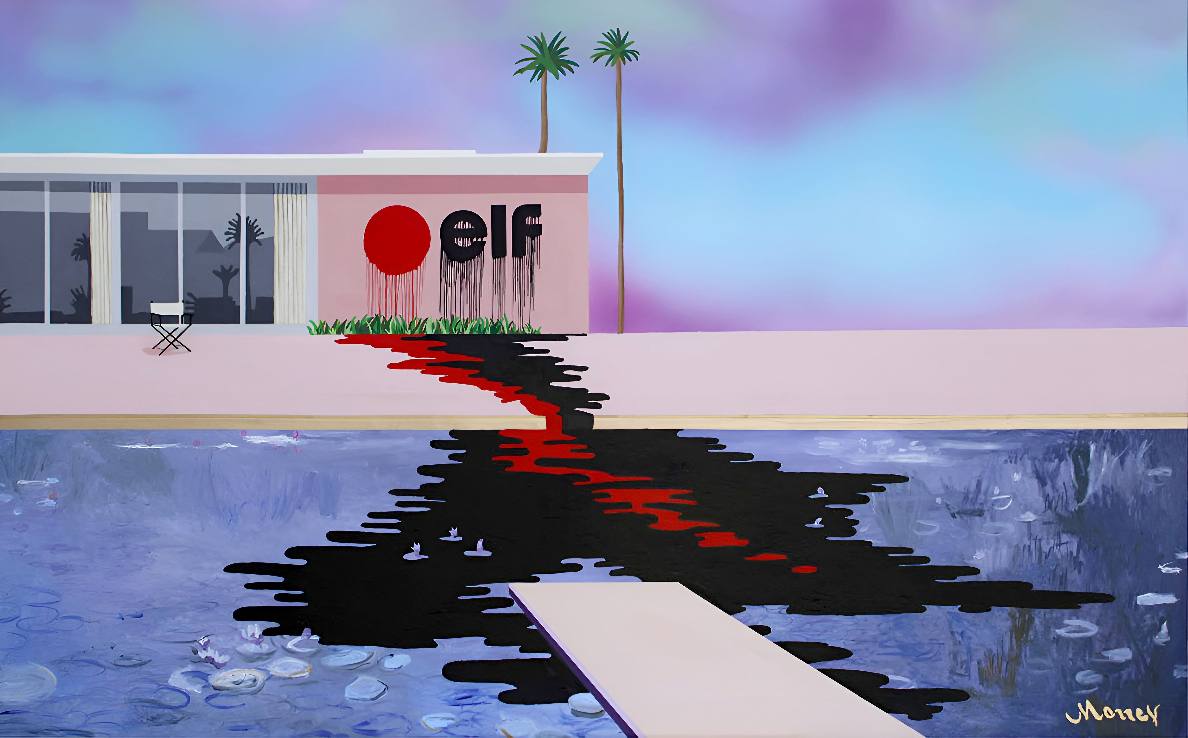 デイヴィッド・ホックニーが1967 年に発表した代表作《A Bigger Splash》を参照に、石油企業のロゴを溶かし込み、豊かな景観の裏側に潜む企業資本主義と環境問題の影を描く作品群《Cycle 1967》。