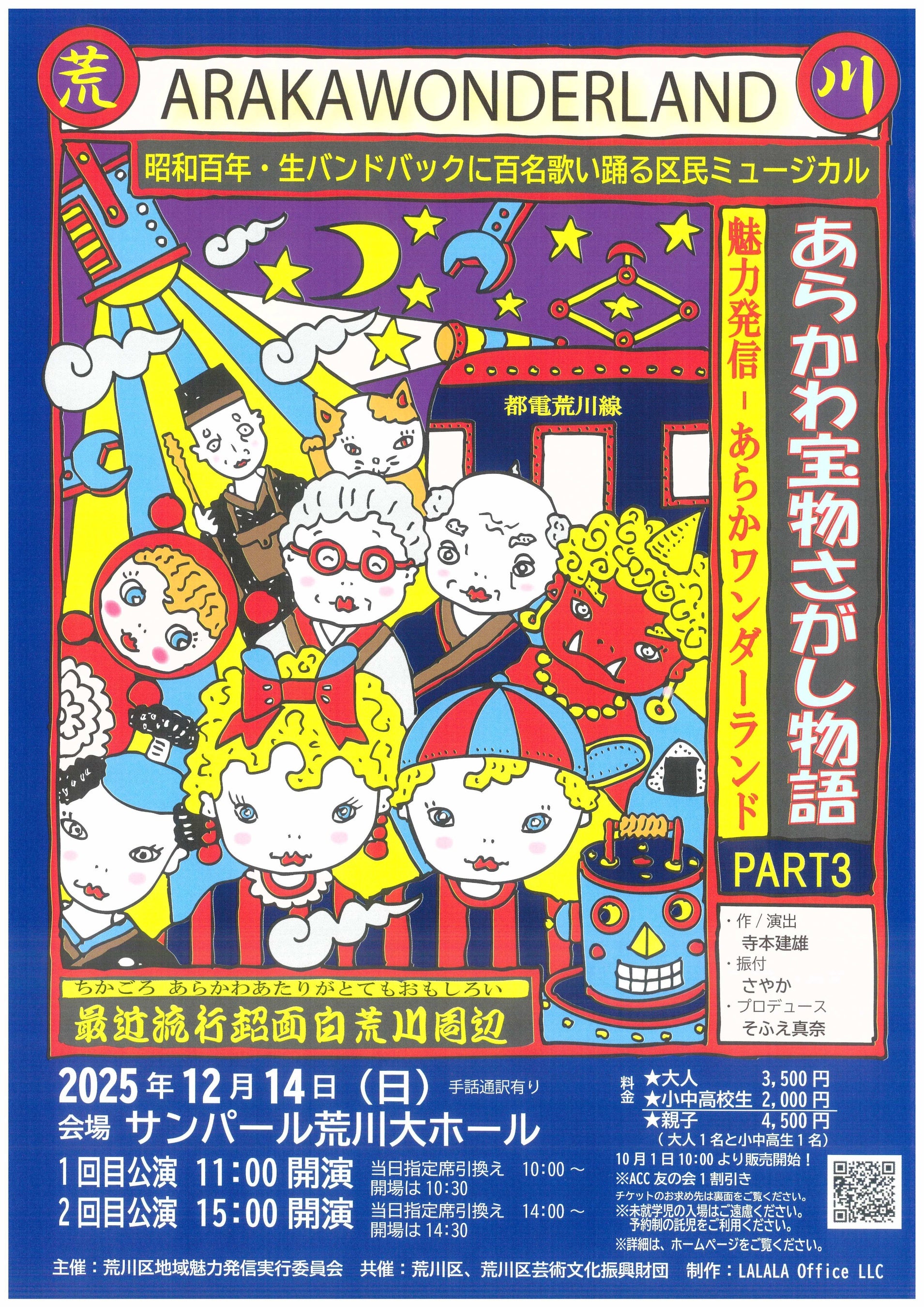 令和7年12月14日(日)、サンパール荒川大ホールにて、荒川区民ミュージカル「あらかわ宝物さがし物語PART3~魅力発信あらかワンダーランド~」を公演します。本作は、オーディションで選ばれた6歳から87歳までの区民約80名に加え、宮城県石巻地区から28名もの方が友情出演。総勢100名を超える出演者が生バンドをバックに歌い踊る、区民が主役のミュージカルです。