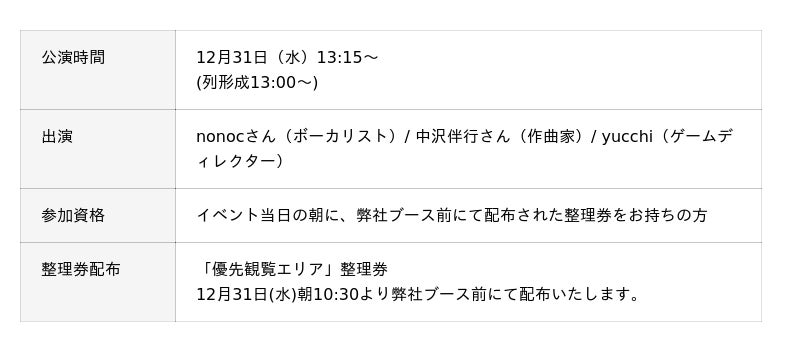 参加には、当日の朝に弊社ブース前にて配布の「優先観覧エリア」整理券が必要となりますので、ご注意くださいませ。