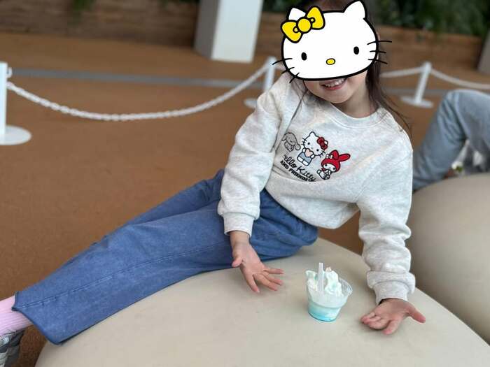 ハローキティデザインのスウェットにデニムパンツをはいた次女が、カメラに向けて大きなエイを紹介するように両手を差し出している様子がなんともほほ笑ましいですね。